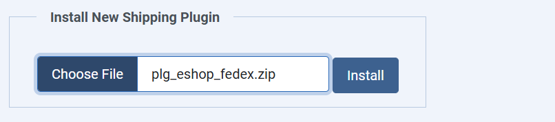 After purchasing EShop Fedex Shipping plugin, you will received the package plg_eshop_fedex.zip. Please login to the back-end of your site, then go to EShop -> Plugins -> Shipping, scroll mouse down to the bottom at Install New Shipping Plugin section, select the package plg_eshop_fedex.zip to install.
