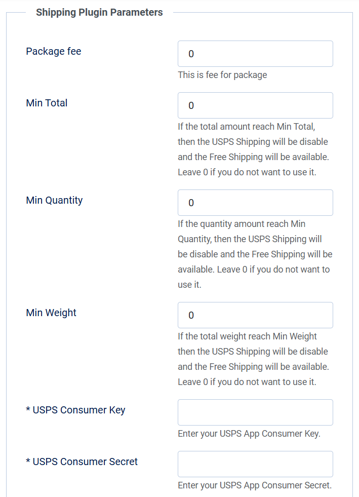 1. The first part, you will see the general parameters of an EShop shipping plugin as: Package fee, Min Total, Min Quantity, Min Weight, let's enter the values for them as you want.