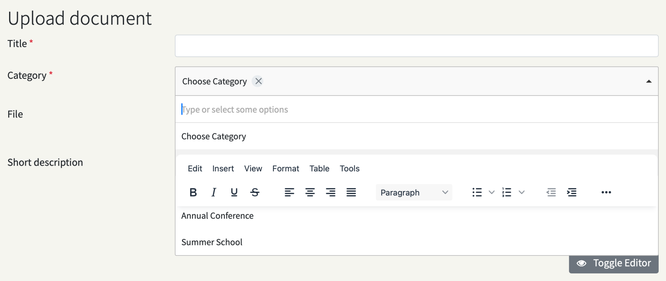 If you change the frontend user profile’s Editor setting to TinyMCE and select Simple Form under Document Upload Form Settings, the editor appears inside the category selection field every time.