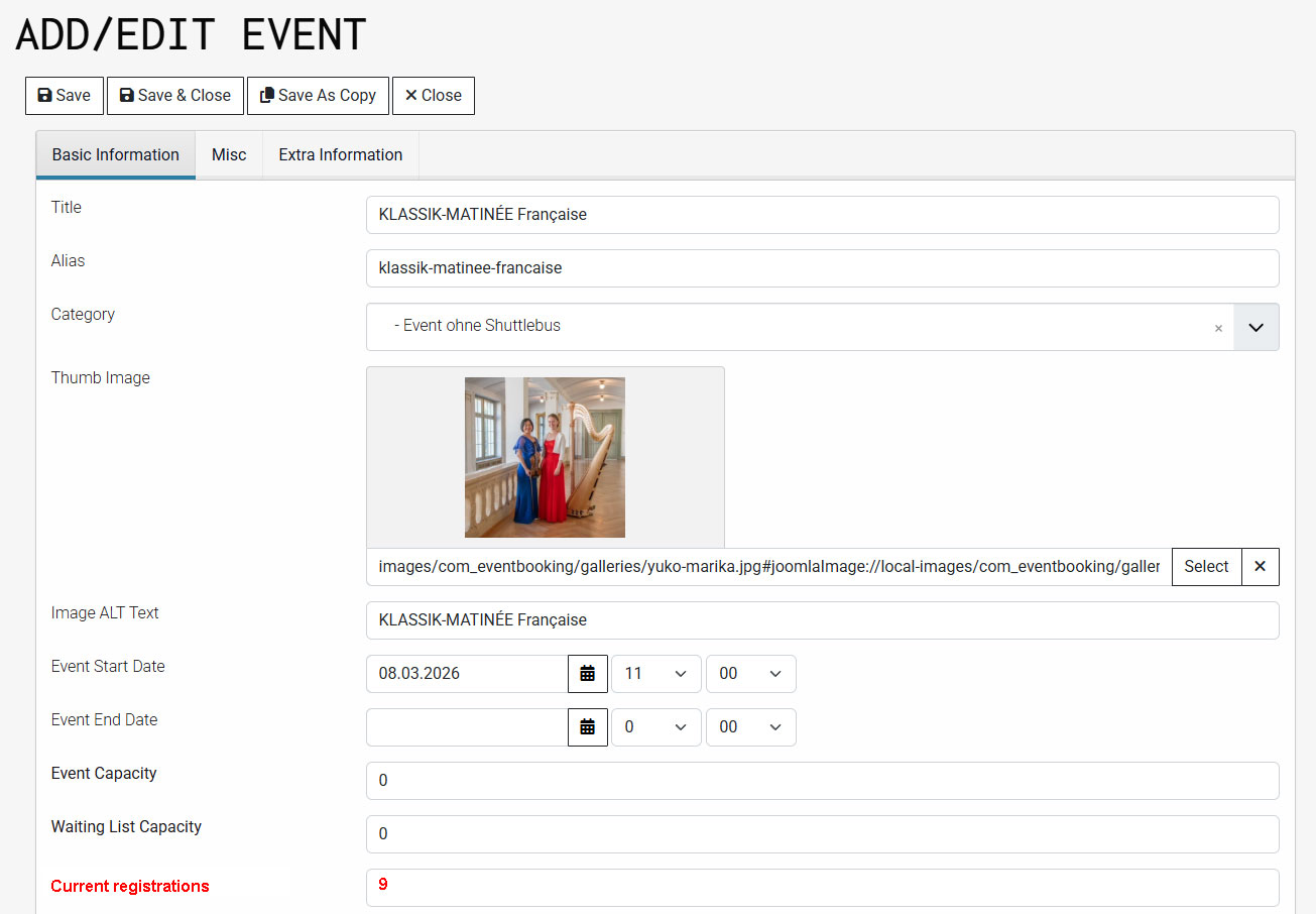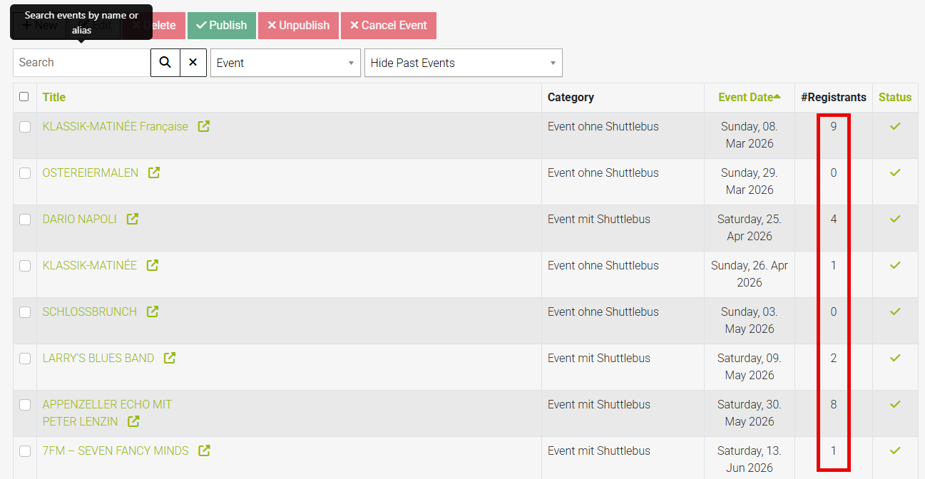 Is there a possibility to show the number of registrants for an event in the front-end management and edit the number manually?