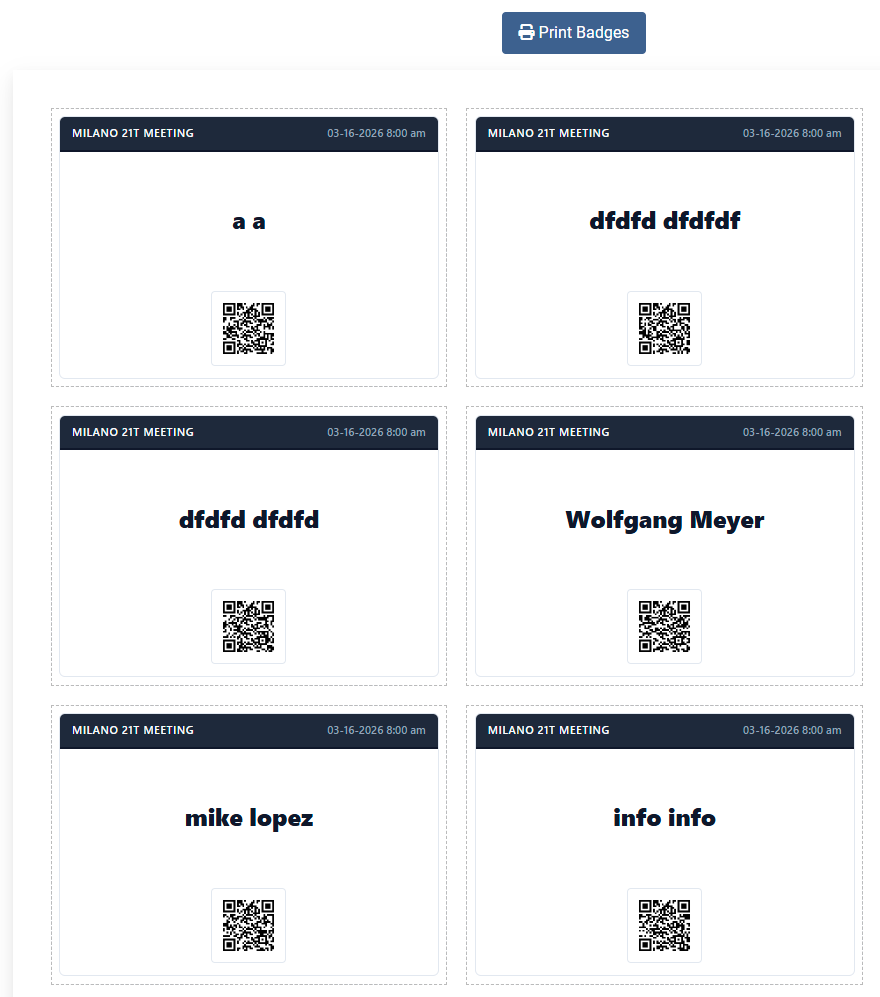 - Now, on registrants management screen, select the event you want to print badges (an event need to be selected before you can print badges), press Export -> Export Buttons in the toolbar. If you want to export badges for selected registrants only, check on the checkbox next to each registrant before pressing Export Badges feature