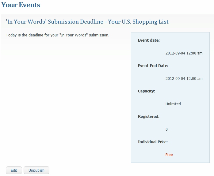 2) When you use a menu to link to "My Submitted Events," it uses the default view (shown below). Due to the problem above, this looks awful. Until we can solve the above problem, is there a way to make "My Submitted Events" take the user to table view?