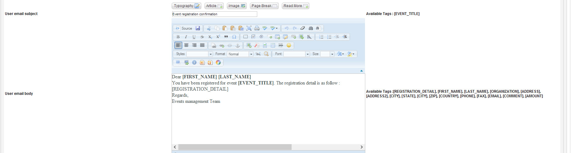 Custom TAGS in user email body