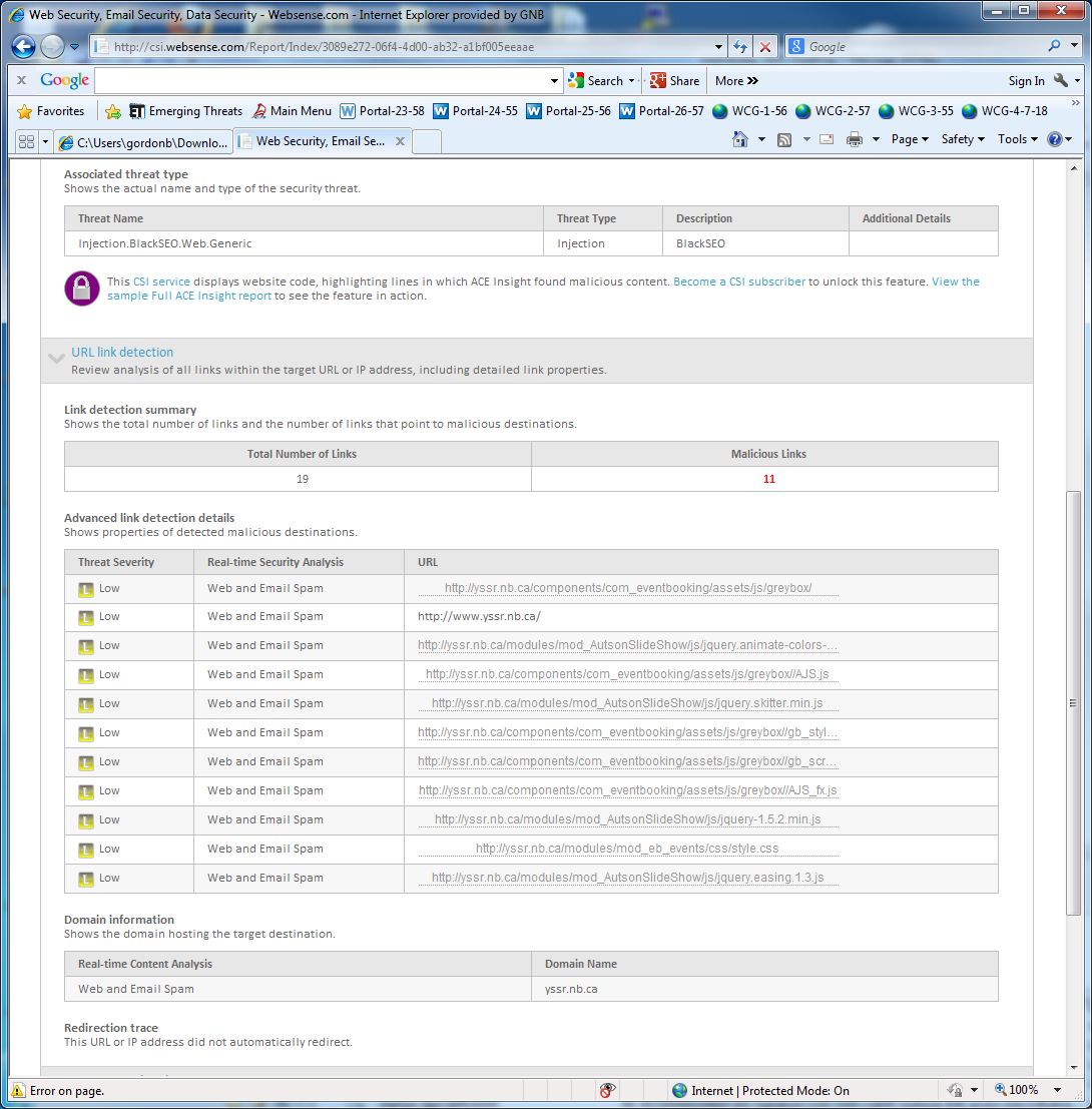 Last week I received a disturbing notice from a client that I had built their website for. The site needs to be accessed by government offices and so they scrutinize the sites and scan regularly for malicious code. To my surprise, apparently some of this malicious code was found in the event booking directories. Now this may be a false positive or the code may resemble something else but I need to clean this up as quickly as possible. Your help would be greatly appreciated in resolving this. I'm sending an attached image of the results but you can also go to the site and run the scan yourself if that would be more helpful at csi.websense.com/ .