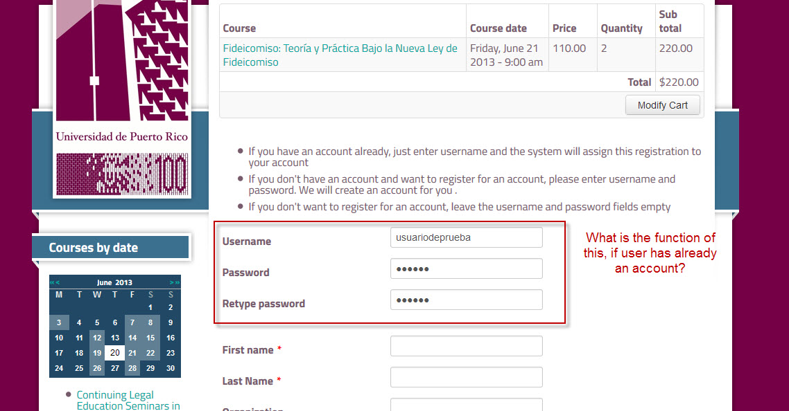Hello Tuan, the event form has as default the registration fields. We came to the situation that when users already have an account they get confused on when ordering of new events. As you can see on my print screen, the instructions are "If you have an account already, just enter username and the system will assign this registration to your account".