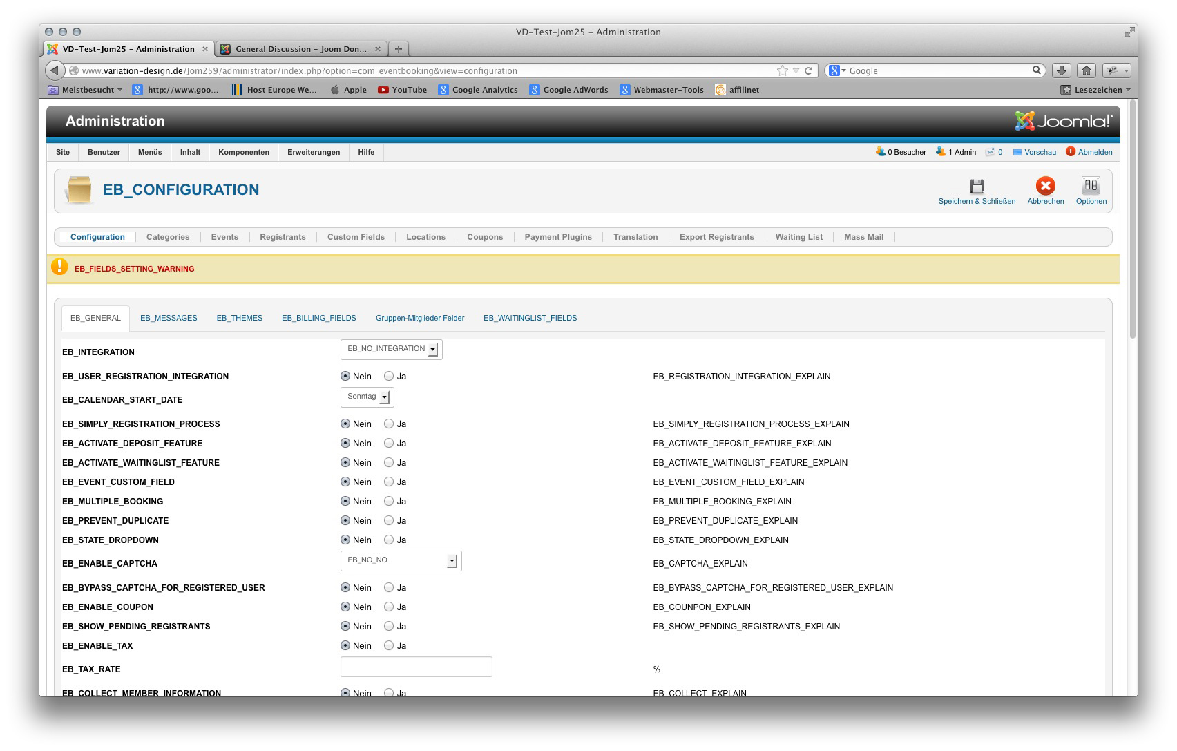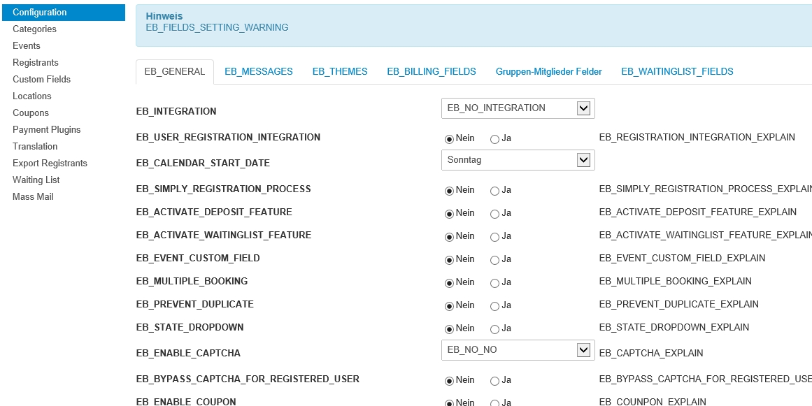 I have installed the component and uploaded the file "de-DE.com_eventbooking.ini" to the administrative languge folder. When I go to the configuration in the backend, I get a strange confusion of German and code strings (please see the screenshot). What could be the problem?