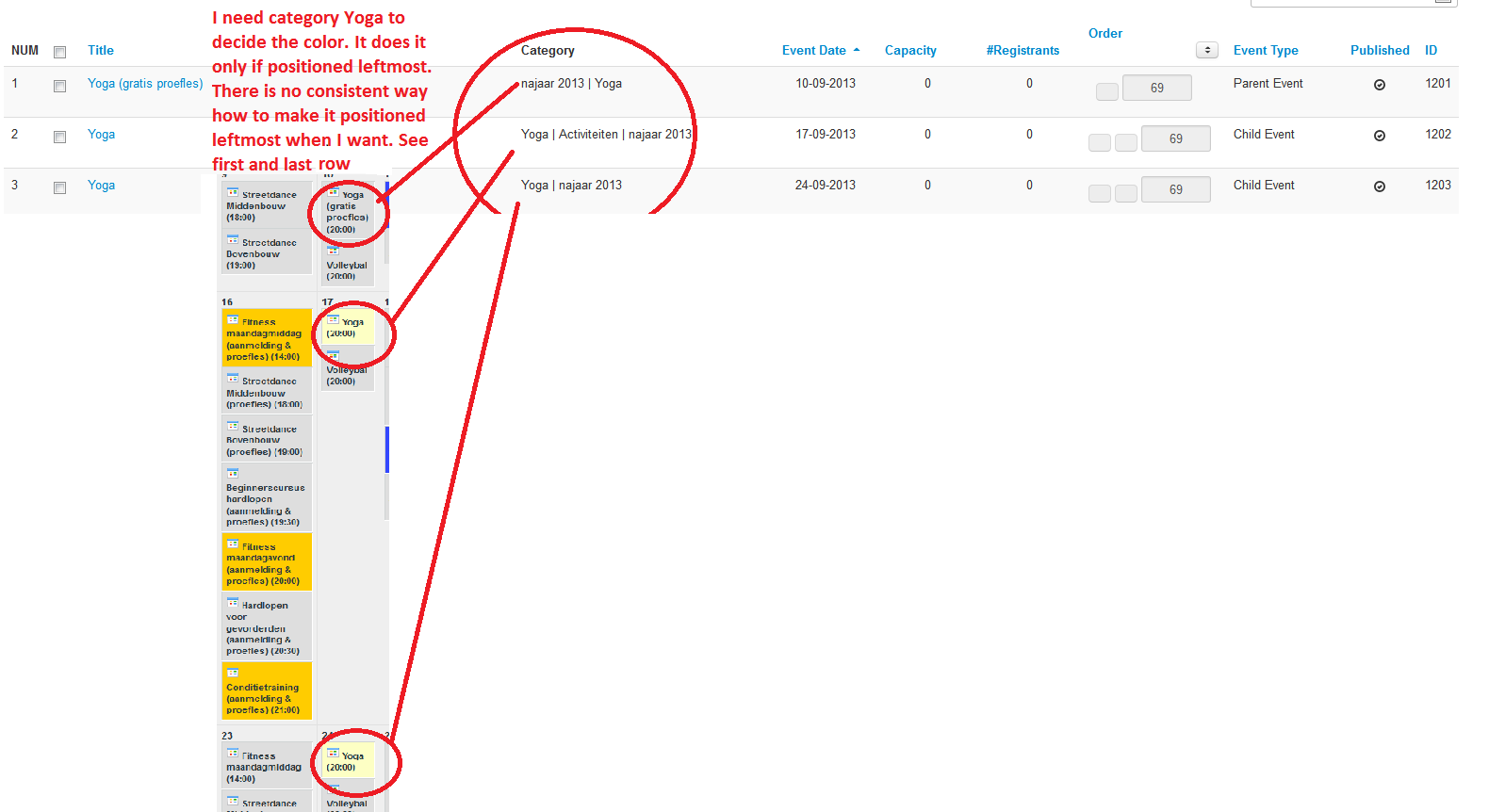 What is improved is that the system now really checks the order of the category and sets the color according to the color defined for the category with the lowest number. BUT! It doesn't distinguish between the top level and sub level categories. So when you have an event that uses both, top level and sub level category, it only compares the number by their order and chooses the one with lower order. It should rather always check whether there is a sub level category first and give it priority even if it has higher order number.