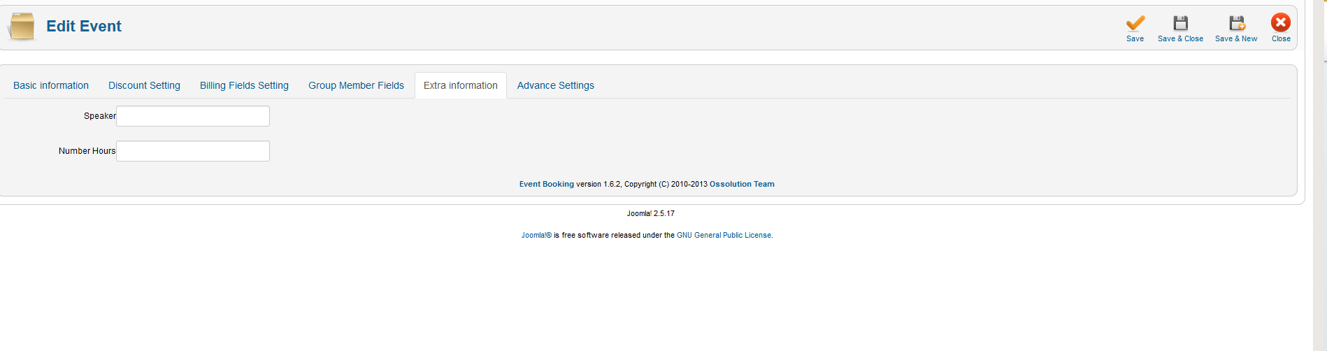 The idea is that right now, there are two sample custom fields which are labelled at "Speaker", "Number Hours". You will change these labels to something you want like (by editing the file components/com_eventbooking/fields.xml):