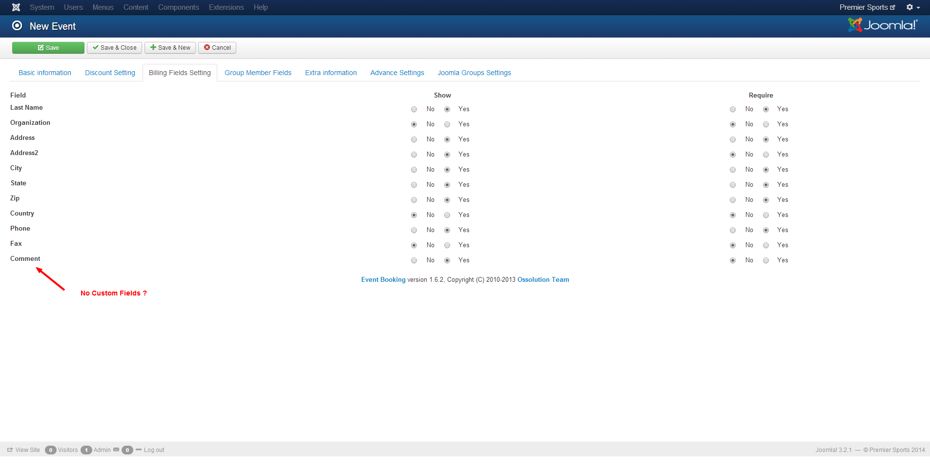 I have created a custom field for the registration form called eb_shirtsize. When creating a new event I want to be able to choose if that field should be shown on the registration form. When creating the new event I click on the Billing Fields Setting tab. It shows all of the core fields, but the custom fields are not available.