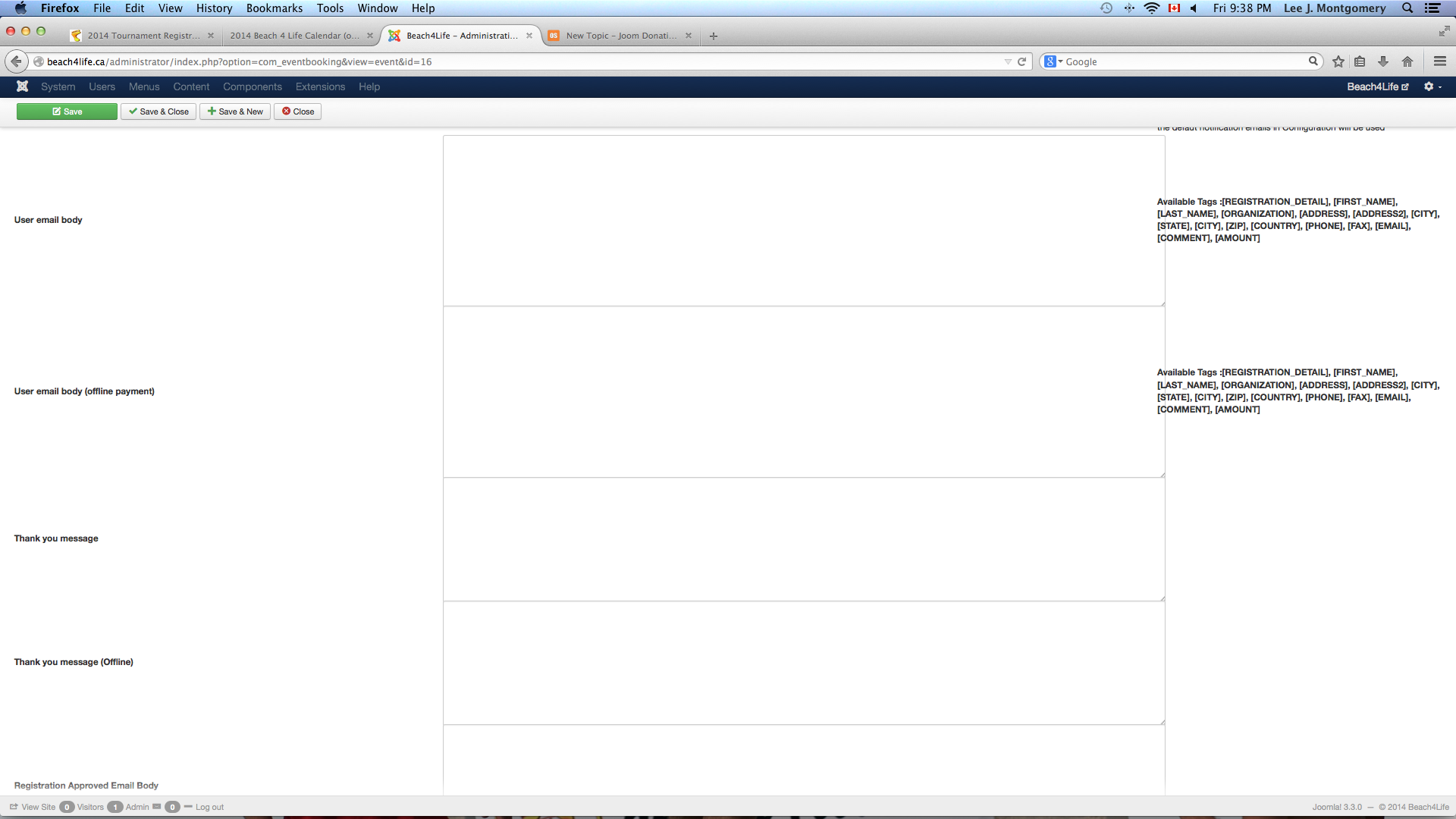 I recently purchased and installed Event Booking into my Joomla 3.3.0. Currently I am unable to save any information in these categories (listed below) in the back end of the template. Any time I input any information, once I click save and go back to check it, does not appear, nor does it appear after an event has been registered for.