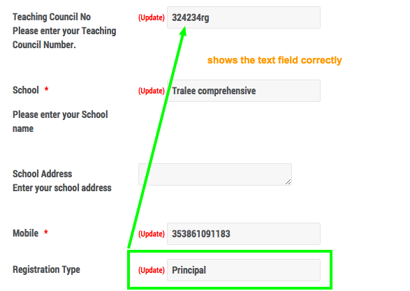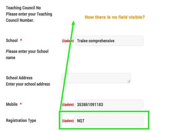 Everything works except on the EB Registration page if a user has selected NQT as an option the eb_TeacherNumber textfield DOES NOT show - only the title. If they select Teacher or Principal the the eb_TeacherNumber textfield DOES show
