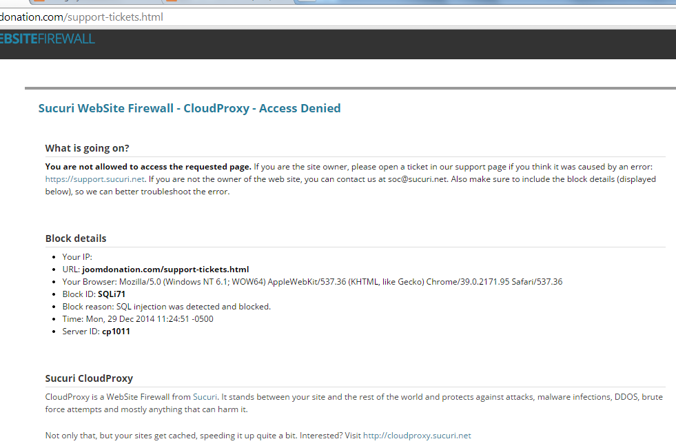 We are trying to send a ticket for the Events Booking component, but every time we submit it the page shows a message like the one attached. We have tried from two different computers with different IP's. The forum does not seem to have anywhere to post this issue, so we were not sure about who we should talk to. We have also sent an email to contact[at]joomdonation.com a day and a half ago, but have not received any answer