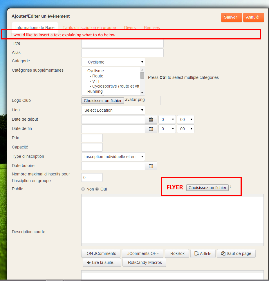 Ps: and if someone knows how to add an other upload button to add the flyer of an event ....
