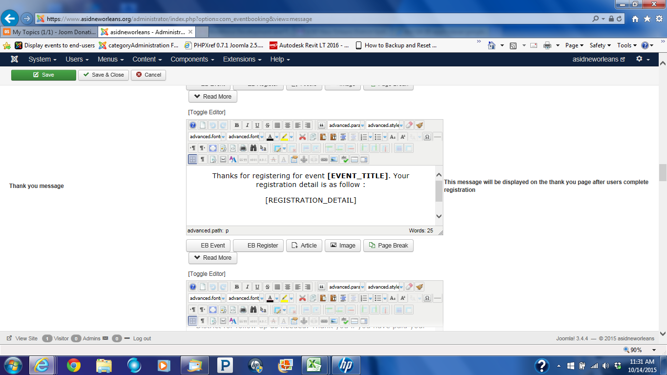 My site host said he had to disable EB Event Plugin to make site go back on-line. I had to do the same yesterday evening and then re-enabled the plug-in - this made the site go back up, but when the Offline Payment people register and click the Confirmation link, it spins for a while and then goes to a blank page instead of showing the proper message confirming and thanking them for registering. See attached for screenshot of the way I have that message filled out.