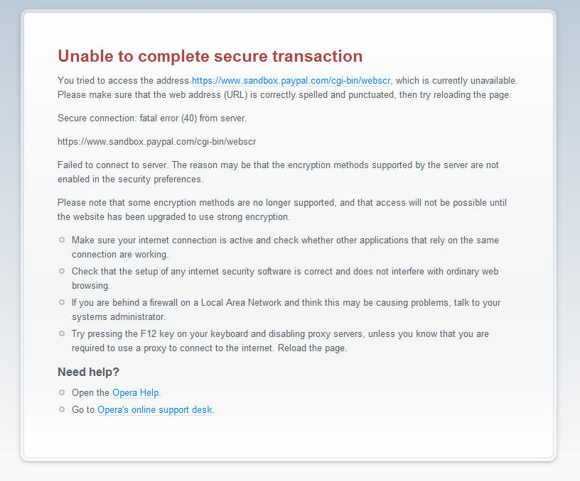 3. Pay Pal window doe not redirect in OPERA. Says its not a secure connection (https) for Pay Pal??????????