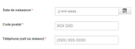 For zip code custom field, I set "placeholder='X9X 9X9' in Extra Field (other way to do it)...