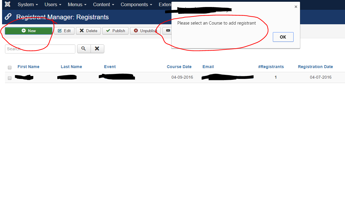 so if I go to the event and check mark and then I go back to the registrants tab, and click new still getting the same error message.