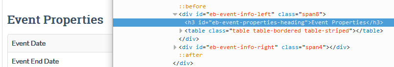 [hr]As for changing the font size, you'll need to add a line of CSS code to the /media/com_eventbooking/assets/css/custom.css file. Lets first find something that we can use to target the element. Right-clicking on the Event Properties text and selecting "inspect element" from the menu, we see: