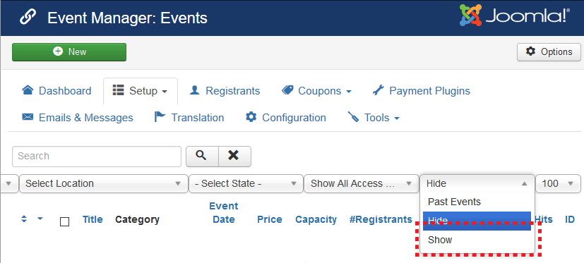 Actually, the events in the dropdown is controlled by Hide past events from events dropdown, so you should set that config option to Yes