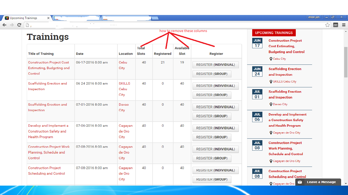 Hi I have a website that will display events using events booking but I cannot figure out how to customize the table layout.. I mean how to remove unnecessary columns for the table layout? I have attached an image of the problem please reply ASAP. Thank you in advance.