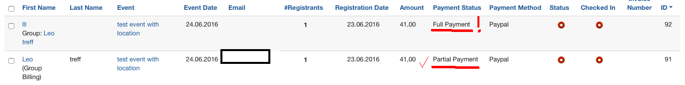 when I register a group and select deposit payment with paypal, then the payment status for the head of the group is set correctly to "partial payment", but for the group member it is set to "full payment", which is not correct (see attachment).