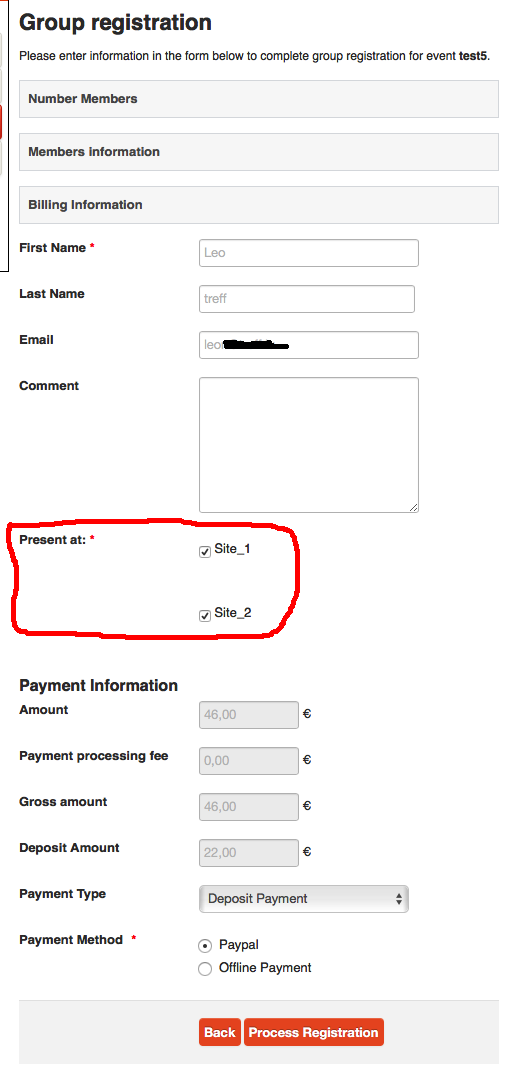 I created a custom field to offer the registrants to indicate wether he/she will be present at either one or both sites of the event.