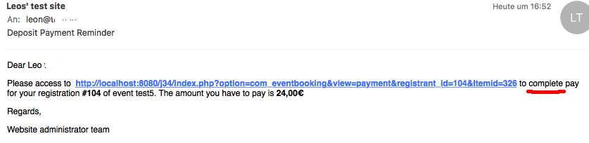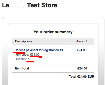 I got a reminder email to complete the payment of an event for which I made a registration with deposit payment. The registration was for a group of 2 members. The text in the reminder email its correct (see attached file EB_deprem1). But the text in the Paypal invoice summary says "Deposit payment for ..." which should be "Remaining payment for ...". In addition, the order summary says: Item price: 24,00 instead of 12,00 , and quantity 1 instead of 2 (see attached file EB_deprem2).