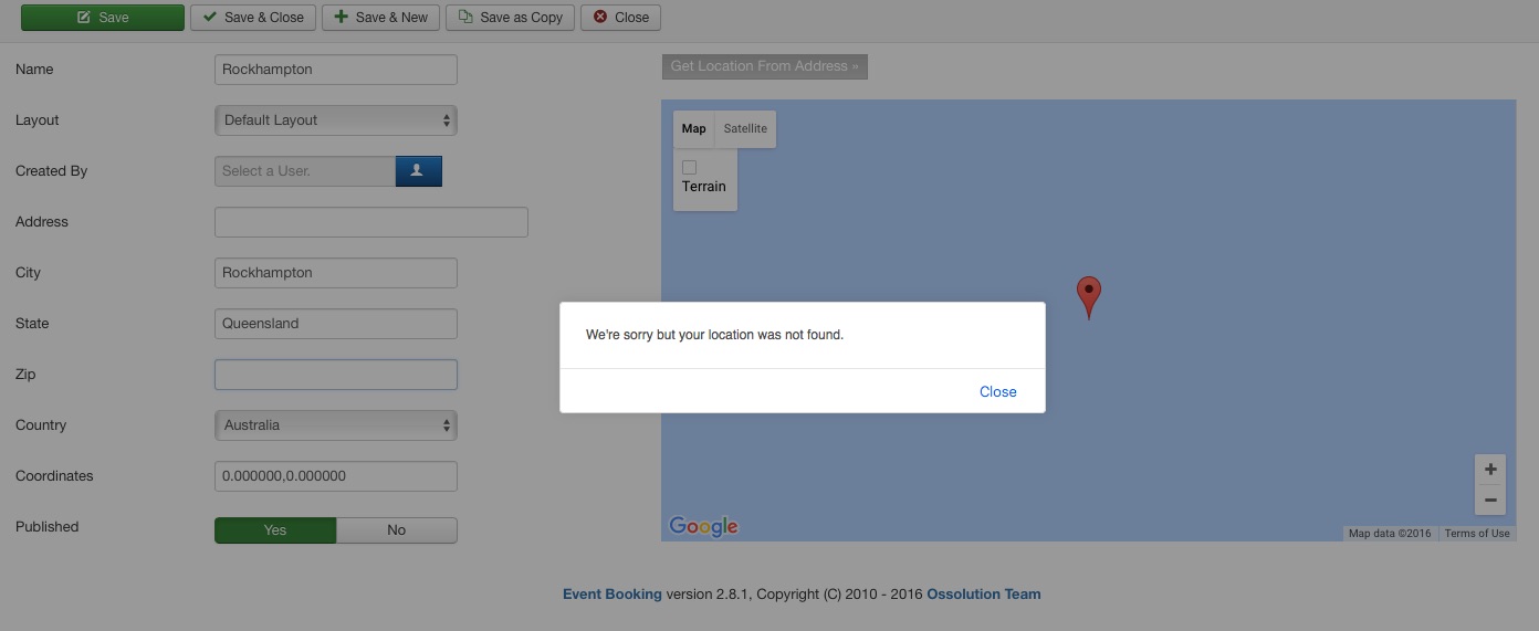 I've attached a screen shot of the error message when I put an City and State name in the Location Manager. I put in the name of the city (Rockhampton, Queensland, Australia) and it is not recognised. Using Google Maps, Rockhampton Queensland is recognised.
