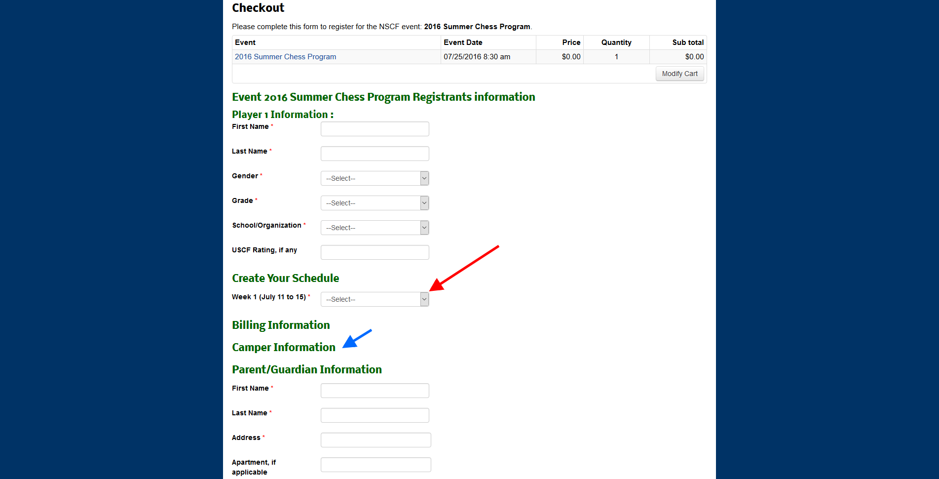 Question 1: How are fields on the registration form ordered? I have a heading field called "Camper Information," but it's the second field. Do you know why it's showing up lower in the registration form (at the blue arrow).