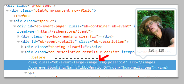 If you have turned OFF the option for "display large image", then that might effect the "eb-event-large-image" tag. If so, right-click on the image and select "Inspect / Inspect Object / Inspect Element / etc" from the pop-up menu. You should see the "<img etc etc etc>" tag highlighted in some code. Look for the "class" attribute, and replace "eb-event-large-image" with the "eb-event..." class you see there.