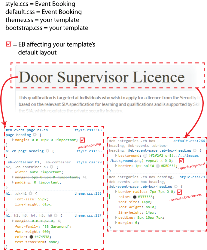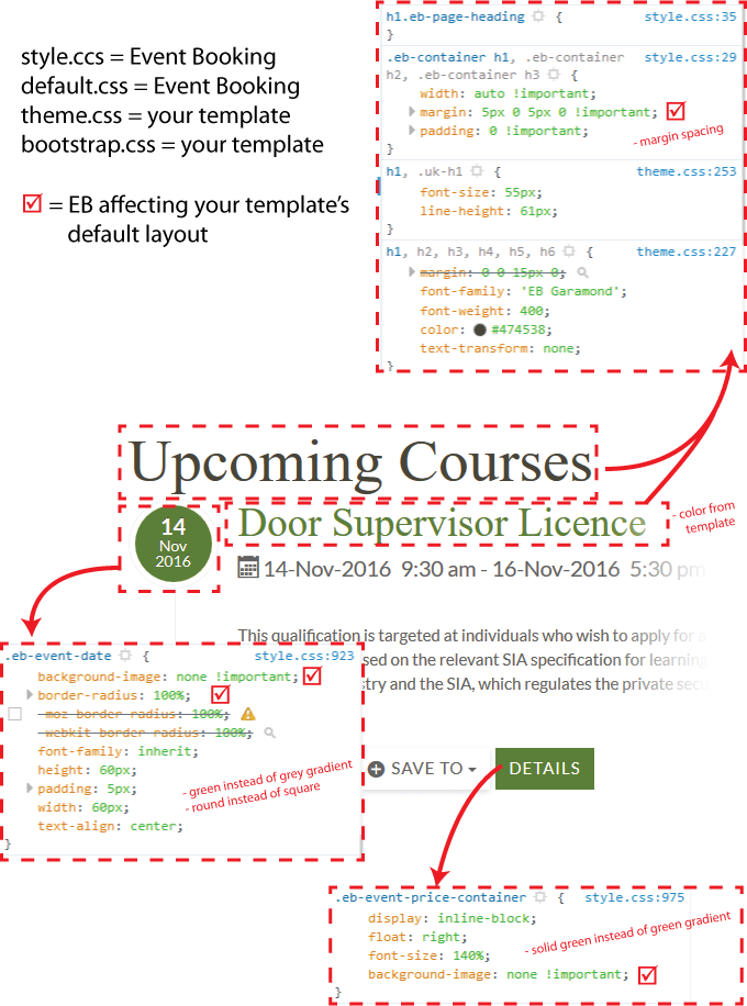 When I created a menu option to display a list of upcoming events, the result uses CSS from the event manager and not from my template e.g. the fonts, sizes of h1, h2 etc. etc.