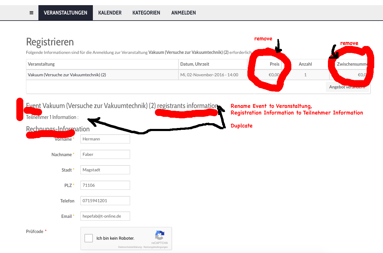 We are a charity organization, that is to say all our events are free of charge. Nevertheless it is necessary that participants register to our events. Is it possible to hide the fields price, sum, etc. because all of them show 0.00 anyway.