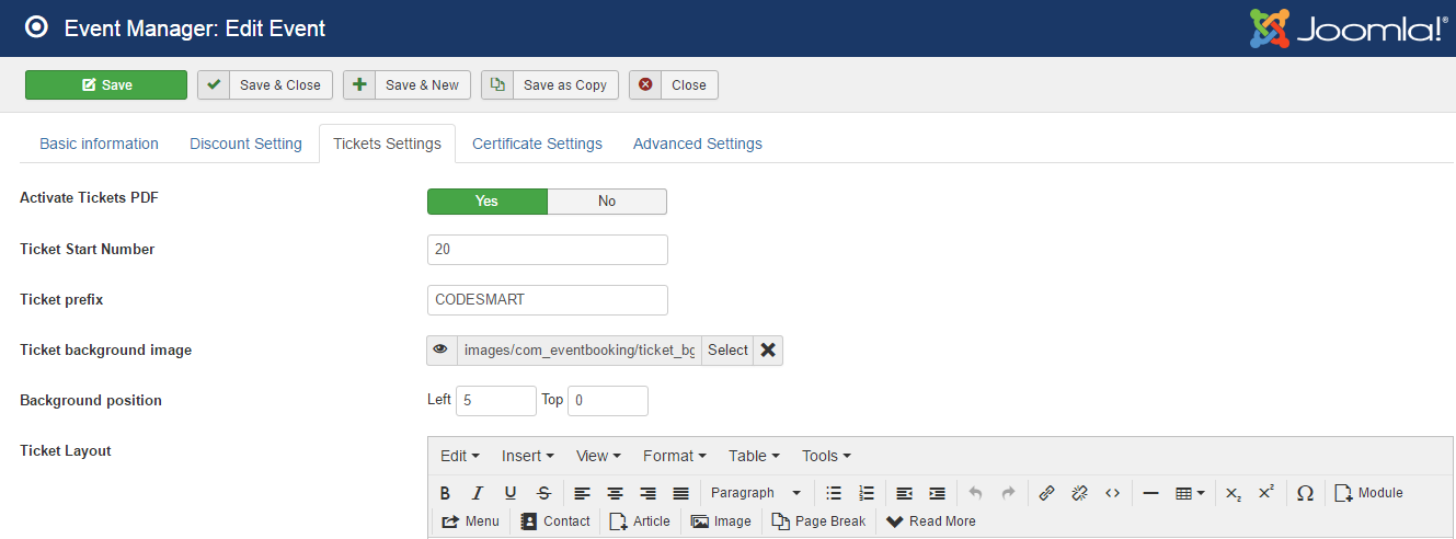 2. In Event, you can select ticket layout, background image, backgorund position....(see the next image)