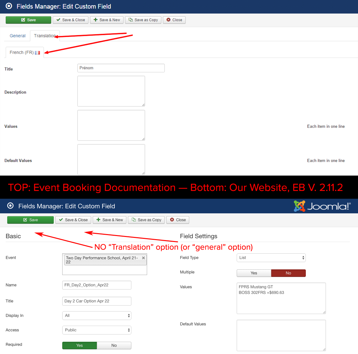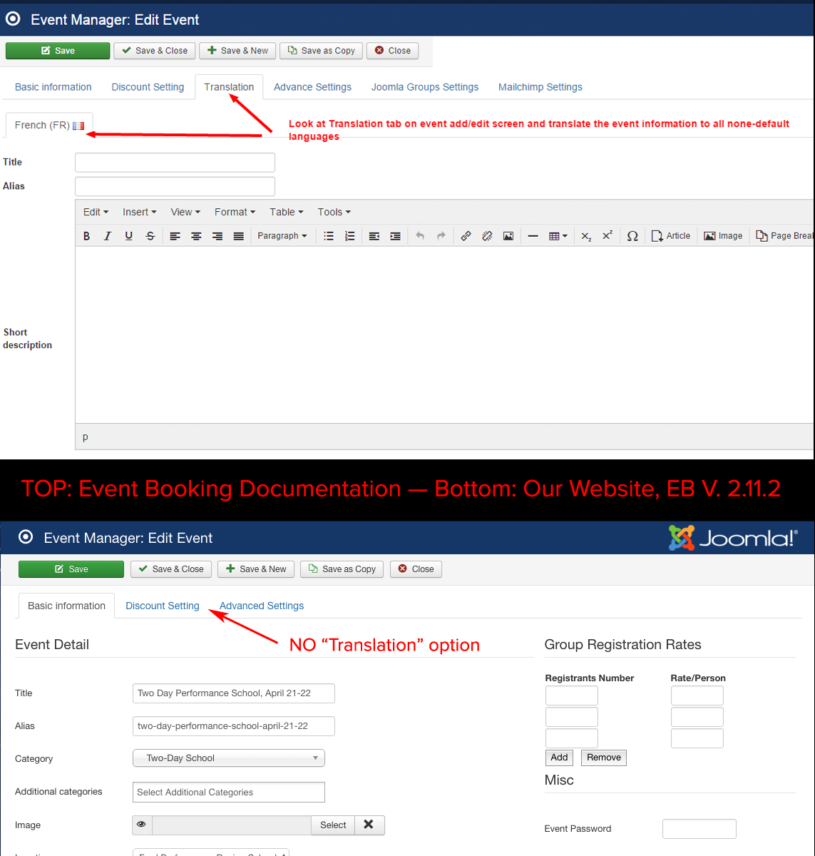 We do see "Translation" in the Dashboard and Components > Event Booking > Translation menu.