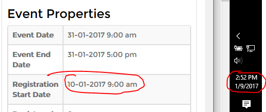 The [Registration Start Date] is set for tomorrow. The buttons won't show up until then
