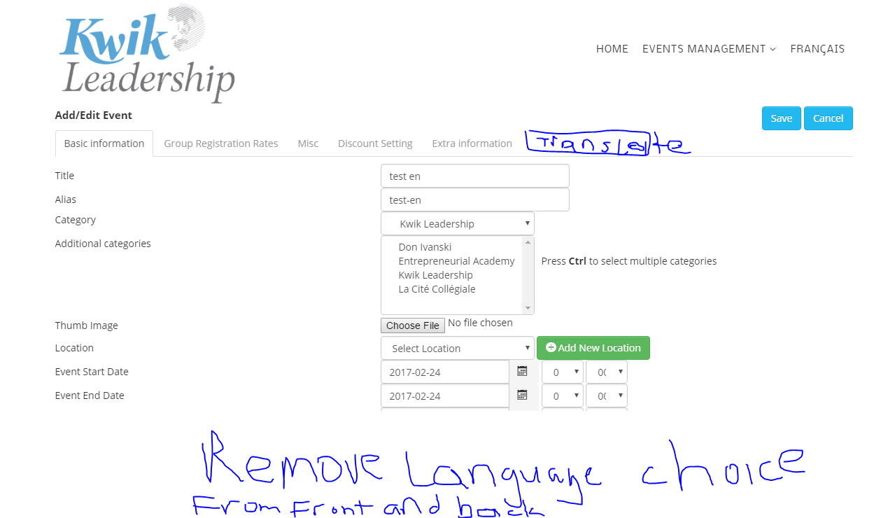 I cannot seem to translate the events from the front end, when submitting a new event, this is critical, also if I set the language of an even to English or French in the back end, it will not display the event in the other language , meaning, that I must set the language to ALL, in the backend, not the end of the world, the biggest issue is not being able to translate the event in the front end, this is not alllowing my registered users to submit an event properly, we anticpate a lot of members, and a lot of events, what can be done about this ASAP...