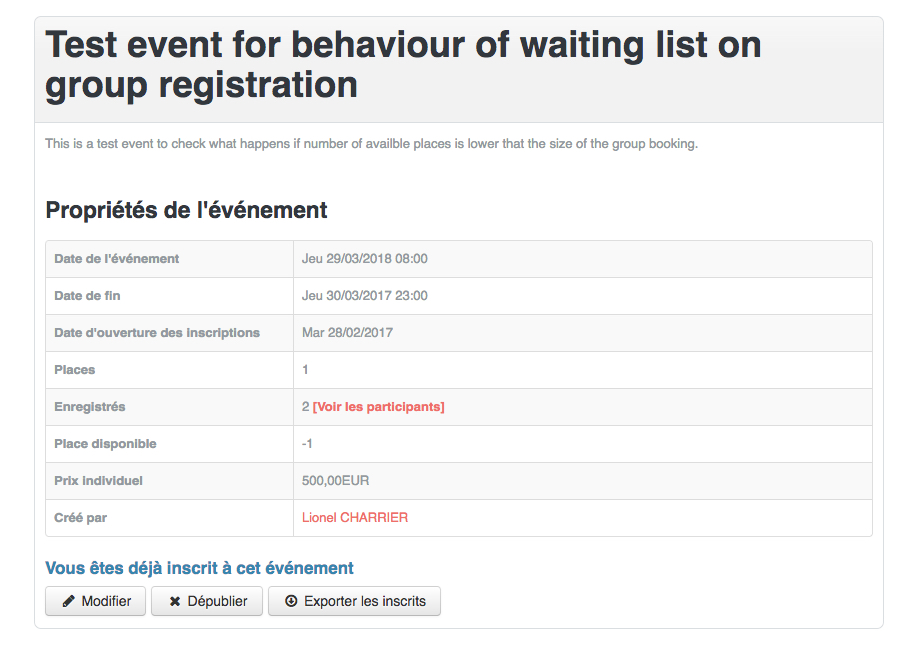 I have changed statuts of both membres to "Waiting List". On front end the list of people booked to the event is empty but I still have " Maximum authorised "1" Booked "2" and remaining place " -1".