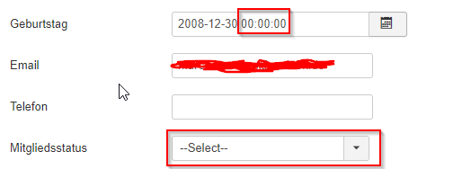 data of birth => Mapping adds at backend the time after the date => Validation won´t accept this. Additionally the date format is not d.m.Y ad I specified it