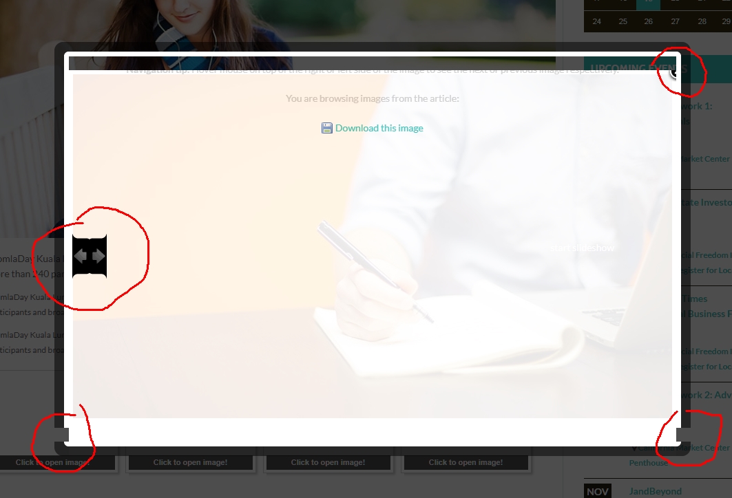 (!) Photos don't display and are sometimes improperly displayed when clicked on. X almost lost in top right. artifacts in bottom corners and left/right arrows are both on the left side only.
