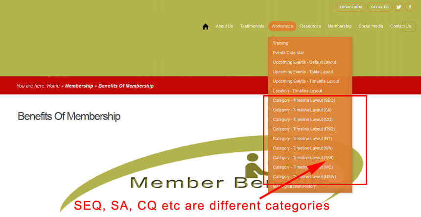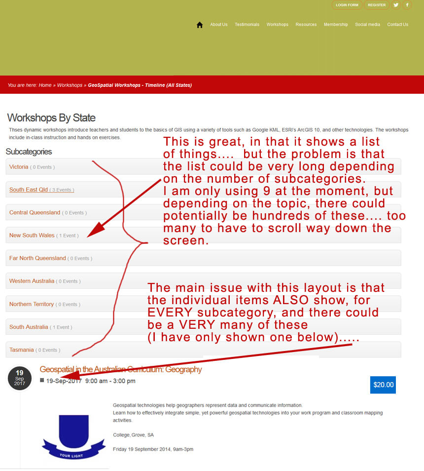 A better way to approach this is in the second screen shot (event_locations_2.jpg), I know I could use a higher level category in the menu item "Category - Timeline Layout", and the screen will display a list of the SubCategories, but the problem is that I could have very many subcategories, and thus the screen page would be very long (I only have 9 now, so its OK)