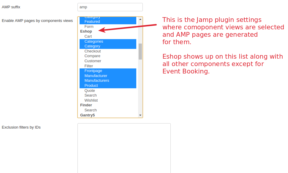 for AMP versions of Joomla sites, Eshop shows up on the list along with all other components except for Events Booking, see attached.