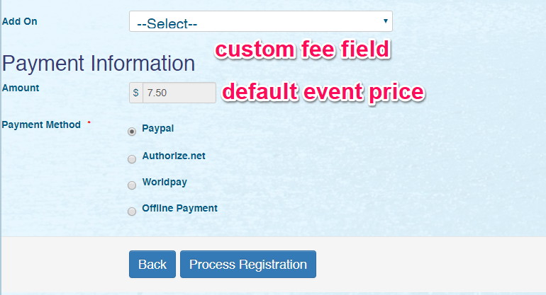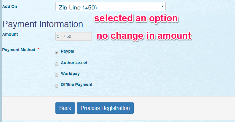 I then changed the field type to checkbox. The result is even weirder. When the page registration page loads, and no option was selected from the custom field, the default registration fee for the event was increased by 1.00, so instead of 7.50, it is showing 8.50. When I selected one option from the custom field, the value did not change.