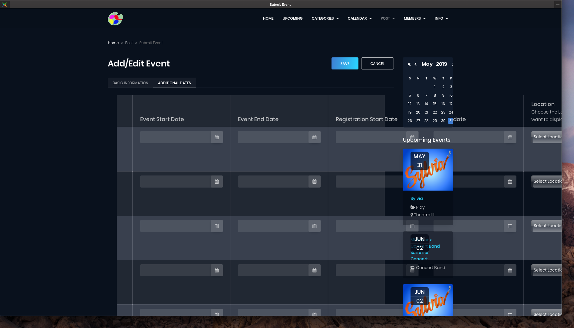 I have been unable to use the "ADDITIONAL DATES" tab in an event submission page on the front end my site which is using your recommended JSN Meetup template. Links which bring up the "Add/Edit Event" page contain "BASIC INFORMATION" and "ADDITIONAL DATES" tabs. Data on the "BASIC INFORMATION" page looks OK while the information on the "ADDITIONAL DATES" tab is spread across the screen and well beyond its position. I cannot find where to edit and restyle this tab and I don't understand why it doesn't respond to styling the page in general since both tabs are accessed with the same menu link. Also event submission seems not to be among the modules or plugins.