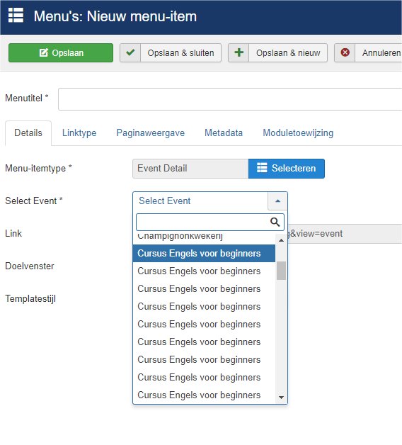 Furthermore, when making a menu-item with "Event Detail" and selecting an Event, you see this complete list with only the title of the event. I can not specificly select the parent event. And that is needed otherwise the complete information of the event isn't shown in the "Event Detail" on the site.