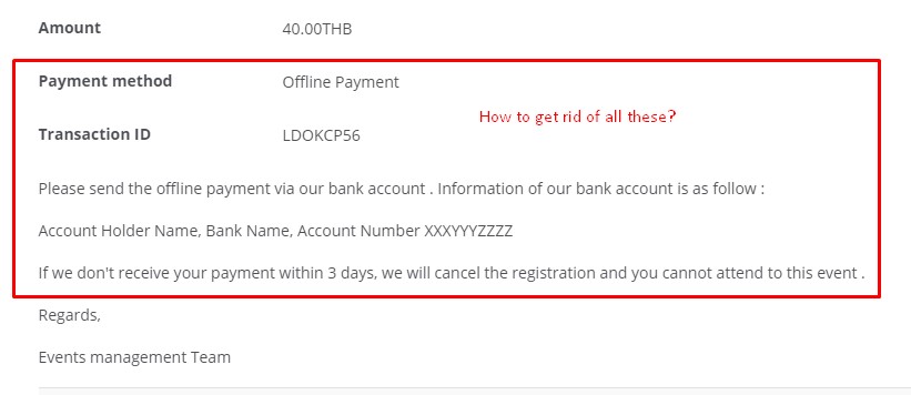 I have an event that is not free, but I do not want to collect payment online, so people will have to pay via the counter at some time in the future. Is there a way to get rid of payment information from being displayed during the individual's registration (see attached screenshot). Also, is there a way to get rid of the payment method, transaction ID and other messages from being displayed once the "Process Registration" button is pressed (see attached screenshot 2). Which files should I change to implement this facility? [ I am using Event Booking version 3.8.3 ]