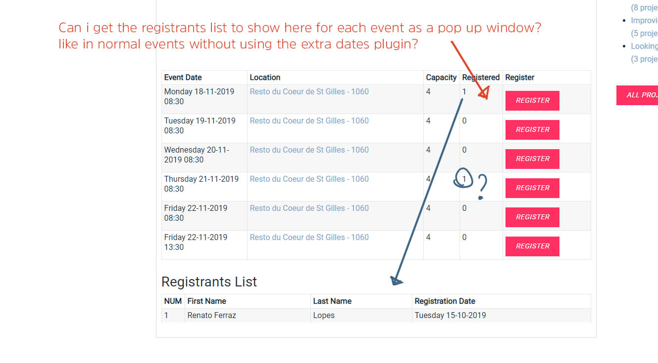 Can i show the registrants list next to the number of registrants? like in normal events without using the extra dates plugin? (see pic)