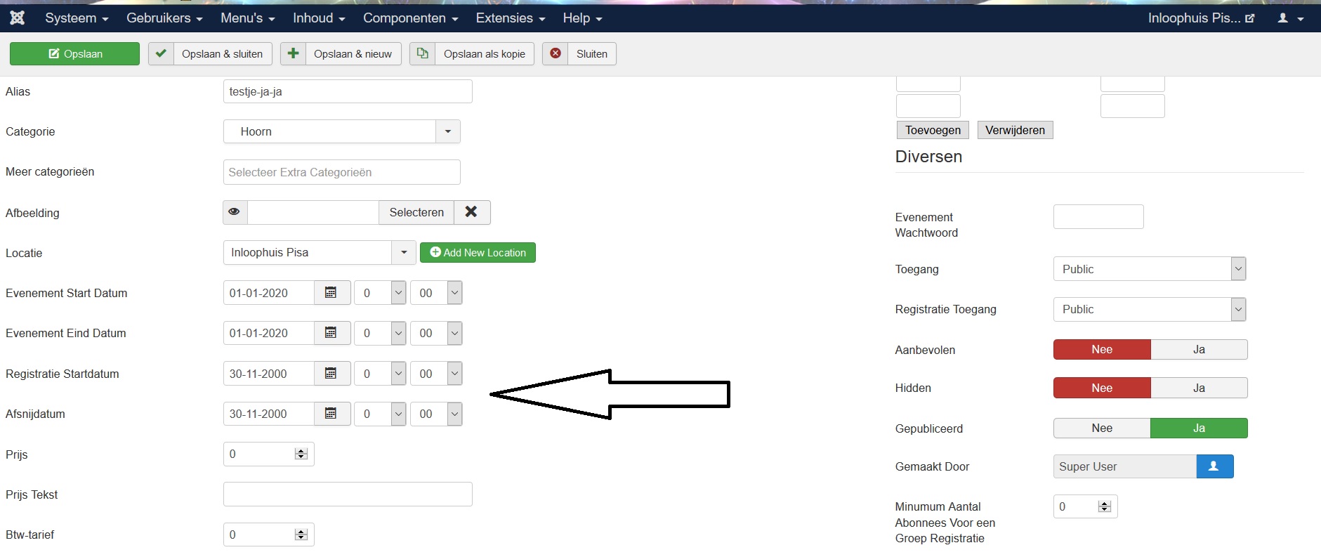 i change the alias itself and than the event is created. But: also the registration startdate is filled in: 30-11-2000??? year 2000 and i haven't filled that part in.