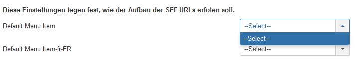In configuration > SEF router setting there are dropdown menus for each language for selecting the default menu item.