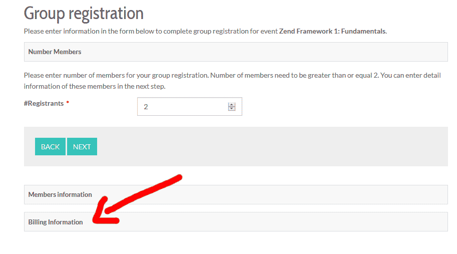 It should be there by default. Maybe your event is free? Go to Events Booking -> Configuration, set Show Billing Step For Free Events config option to Yes, then check it again to see if it solves your issue?
