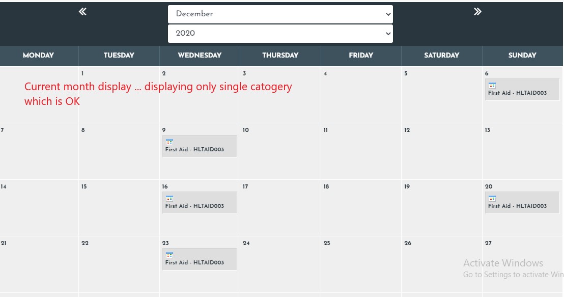 I selected one category from multiple for monthly calendar view, I can see that category in current month only than I click/navigate on the next month I see all categories in next month which I don't want, I just wanted a single category displayed on all months view.